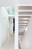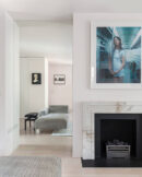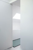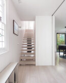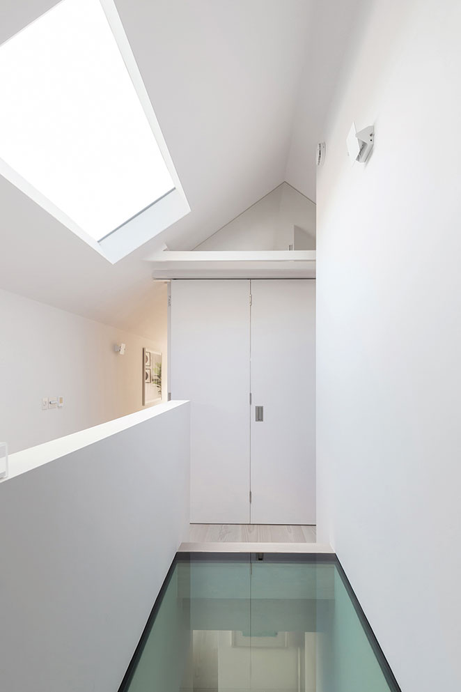 Elsewhere, a glass floor between the first and second floors, combined with a large rooflight above, brings natural light and views of the sky down two levels into the building, while the open-riser staircase allows the light to continue onwards, down another storey to the ground floor. In the sitting room, which has the traditional layout of a central fireplace with recesses on either side, each recess is fully mirrored. This creates a visual ‘doubling’ of the living space, which gives the impression that the project is a conversion of not one, but two terraced houses.