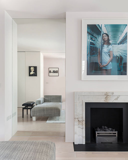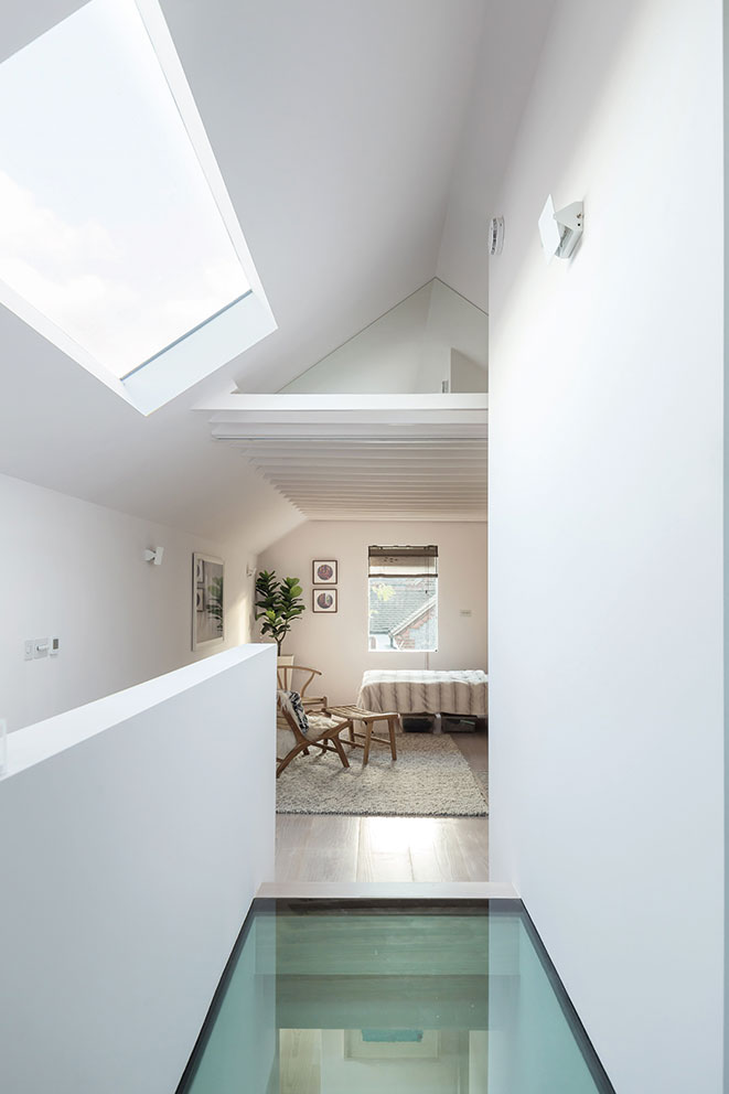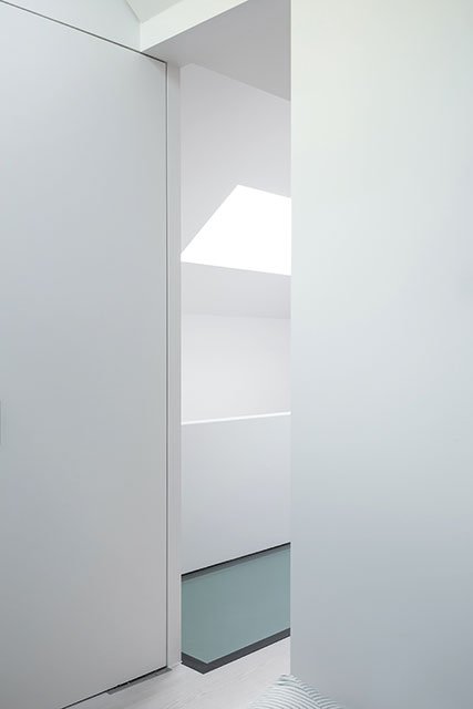 Here, an open living room can be converted into a private bedroom, closed off from the landing by pocket doors that form a partition. The wall above the doors is clad in a frameless mirror. This creates the illusion there is no wall and the ceiling is continuous, making the space feel open at all times.