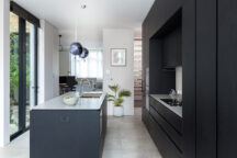 Here, Lily and Al have played with contrast, choosing dark kitchen cabinetry from Espresso Kitchens in a sleek, minimalist style. The kitchen island and countertops are Silestone from Cosentino, in ‘Desert Silver Suede.’