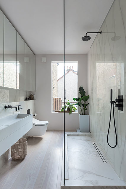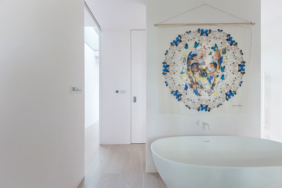 With no radiators cluttering up the walls, the couple were able to achieve the flawless, lightness of touch that characterises this renovation. Inside, the minimalist approach never feels stark, thanks to the variety of angles from which light falls into spaces. The quality of the finish throughout is a key element in making this approach a success. Mirrors fit spaces exactly and doors slide soundlessly out of sight into walls. Indeed, having so few walls – or the perception of walls – creates the sense of an airy, multi-dimensional space, grounded in the tactile warmth of natural timber floors from Chaunceys.