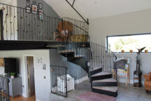 The staircase is built from mild steel powder coated in a metallic finish chosen to complement the property’s exposed timbers. This is offset by solid oak treads in a natural finish. A hand-forged handrail sits atop sleek round spindles and curves sinuously down, ending in a volute supported by a curtail block. This design adds elegance and creates a feature of the open staircase while easing movement up and down the stairs.