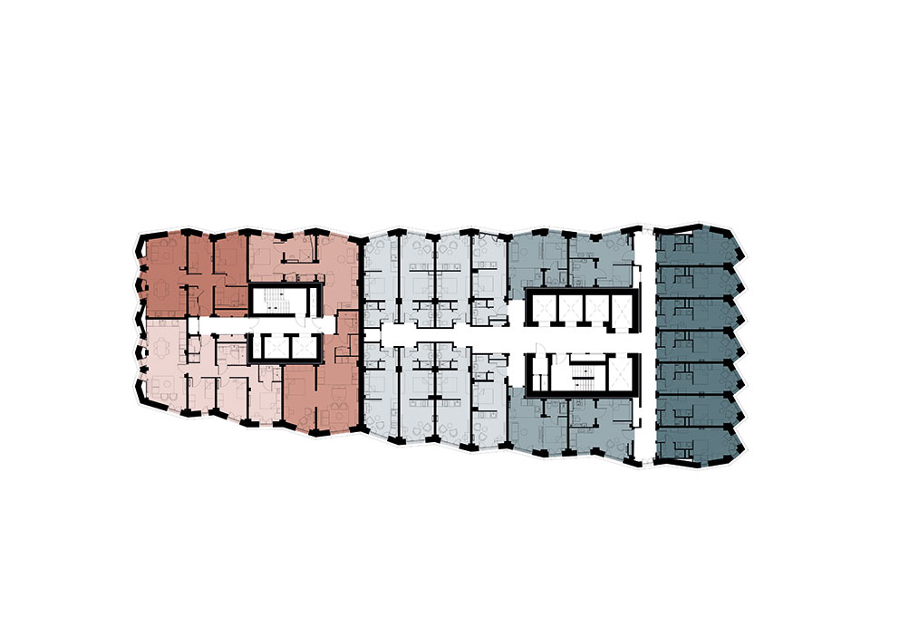 The extensive north-facing aspect limited scope for direct sunlight, so exaggerated folds were introduced in the facade to create triangulated oriel windows which introduce east and west sunlight into apartments.