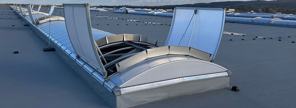 LAMILUX offers more than just premium glass rooflights. Our range includes high-performance solutions for industrial and commercial daylighting, including the LAMILUX Continuous Barrel Vault Rooflight and the Rooflight F100 W Dome – both available with certified SHEV (EN 12101-2) options.